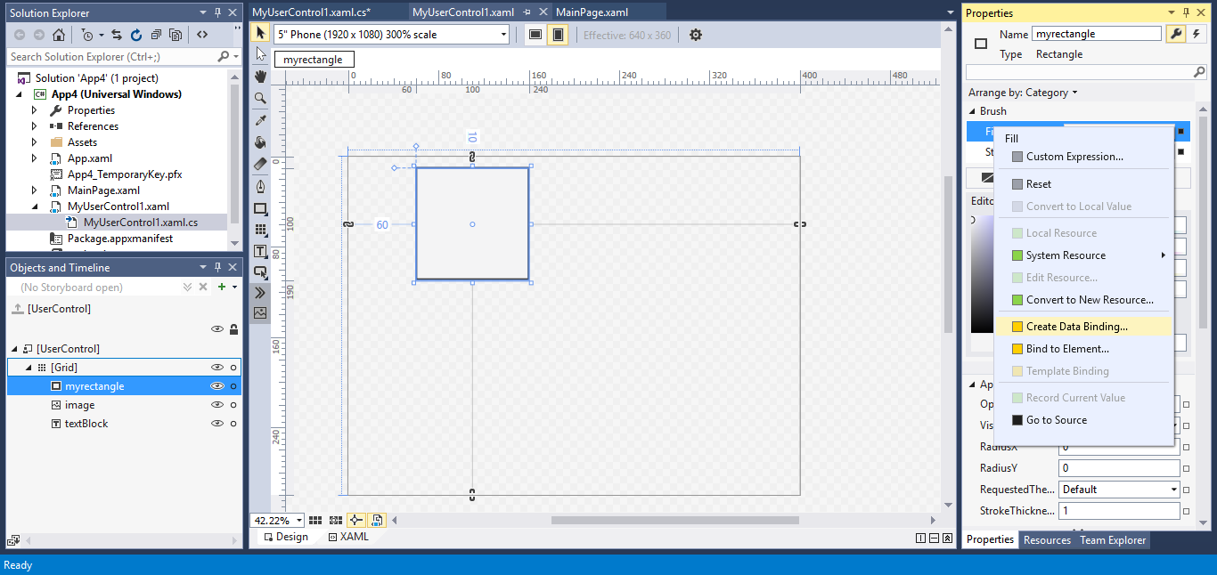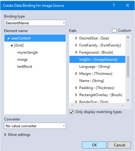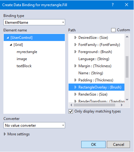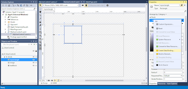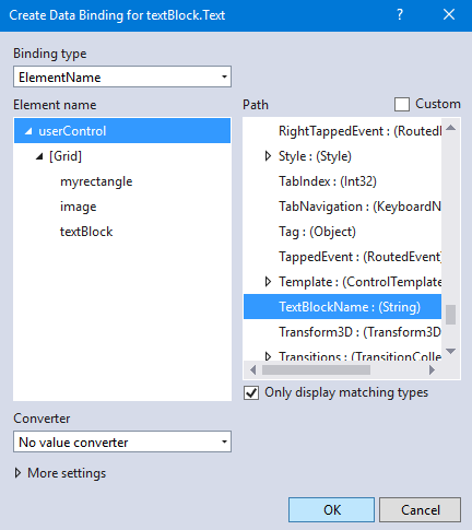 The tricky part starts from here.Now we select that particular control which we want to bind with the CustomControl.So simply select that control and in the properties window select particular property and create data binding.After this a pop up window will open up and simply select the Element name and User control and give a property value and Press OK.Same is the case with all the controls.