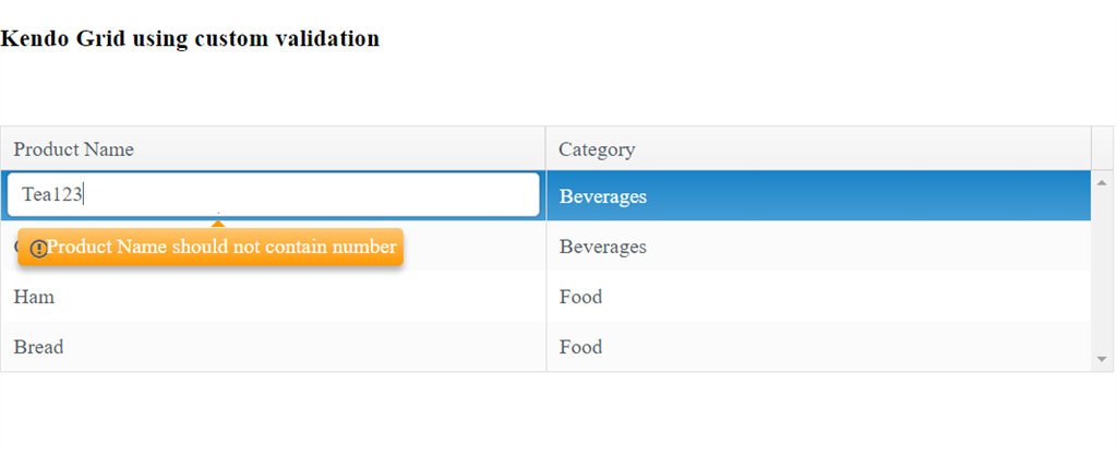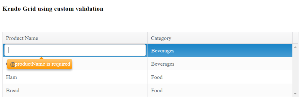 From the above code, you can observe the validation for the Product Name field which is defined in the Kendo Grid schema. In this example, two validations are applied on the Product Name field.