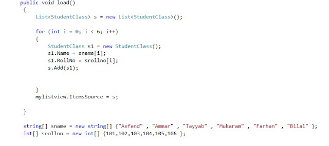 Step 4: Now it's time to move on to the controller section of our appliction.For this purpose we create a simple function and in this function we'll create an instance of a List with our class object. We'll declare two arrays; one for holding our rollnumbers and the other is for holding our names.Now we can add a for loop and create an object of our Model Class and call the properties of our Model Class and assign an array value to these.Now we can add the Model Class object to our list by using s.Add(s1) ;