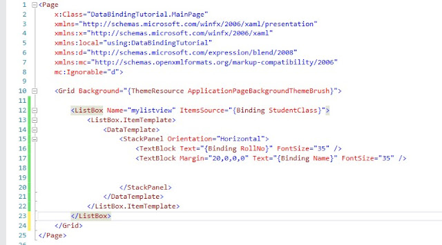 Step 3: After the successful creation of your model we will create a View in MainPage.xaml.For that purpose we will need a listbox and in this list box we'll add itemtemplate and datatemplate and between these we'll add some textblocks and bind the Text property of textblock with our class methods. We'll also bind the itemsource of our listbox to the Model class name.