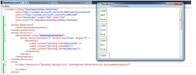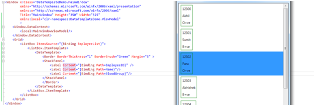 Simple way to create DataTemplate is to set the ItemTemplate property of the Control(ListBox used in this example) to a DataTemplate. Your DataTemplate is the the visual structure of your data object. The following DataTemplate is very simple. We are having stackpanel and three items appears as three Label elements within a StackPanel. Each Label element is bound to a property of the Employee class.