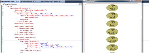 Data Template With ItemsControl ItemsControl is just having collection of your items here you define only the ItemSource. But you can use itemsControl better with DataTemplate. In the below example we are binding our ItemsControl with EmployeeList and we are using the Template property to specify a ControlTemplate to define the appearance of an ItemsControl. We are Using the ItemsPanel property to specify an ItemsPanelTemplate that defines the panel that is used to hold the generated items and Using the ItemTemplate to set a DataTemplate to define the visualization of the data objects .We are using the ItemContainerStyle property to specify the appearance of the element that contains the data.