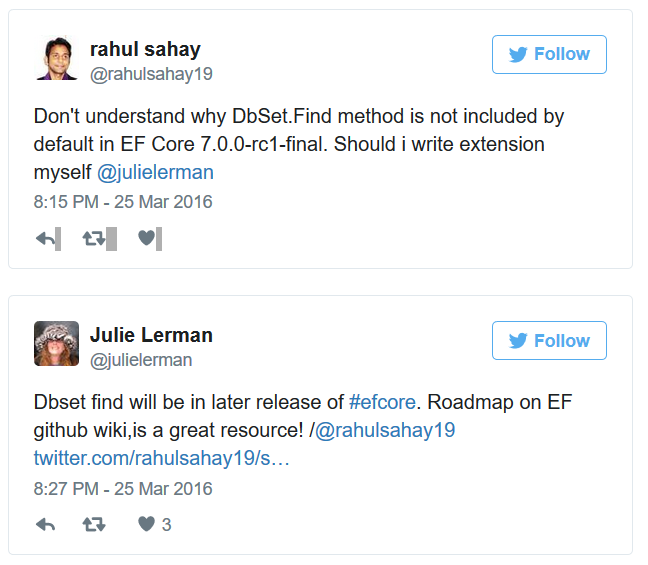 Recently, I was writing the infrastructure part of My Movie Review SPA app using ASP.NET Core version. Then, I landed in a really weird situation where in DBSet.Find() a piece is missing. This is a really crucial extension method for finding the record based on the primary key. In order to find the solution, I thought it would be nice to talk to EF Guru Julie Lerman directly. Here is what I asked her and what she replied on the same.