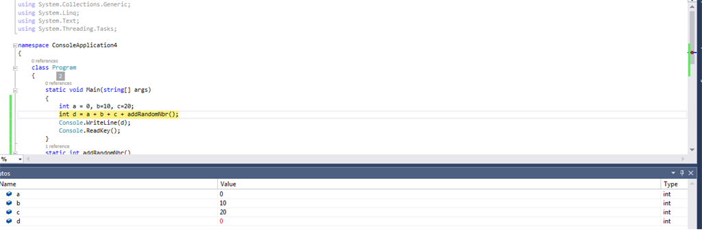 Let's press F10, Now we can inspect values of all variables and return value of method addRandomNbr() as well.