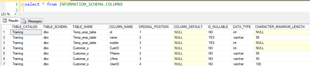 - INFORMATION_SCHEMA.COLUMNS method only provides the physical information related to all the columns like Table name, column name, data type and other information data types and domain related information.