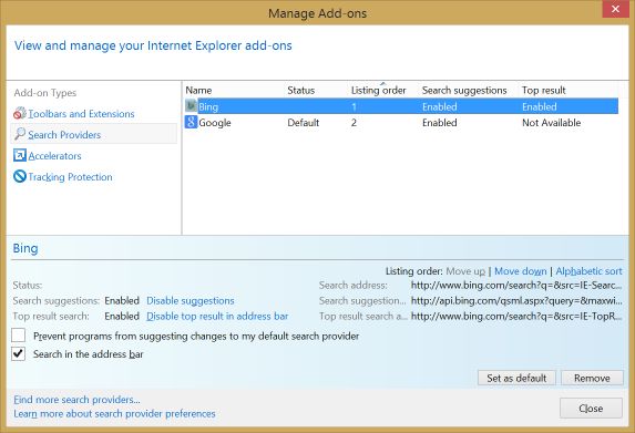 If you are using Windows 8 or 8.1, your have Internet Explorer 11 running as the default browser on your machine. IE 11 and Windows 8 use Microsoft Bing as the default search provider. Bing also suggest search results at the top. I found these search result annoying.