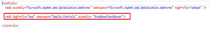 Finally, Register control by adding the following line in the web.configsettings which allows us to use <asp: DropDownCheckBoxes></asp:DropDownCheckBoxes> tag