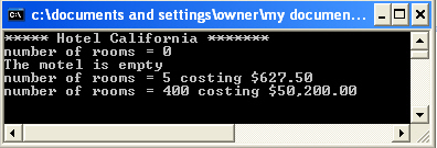 Console.WriteLine ("number of rooms = {0} costing {1:c}", motel1.NumberOfRooms, motel1 .CalculateRate )