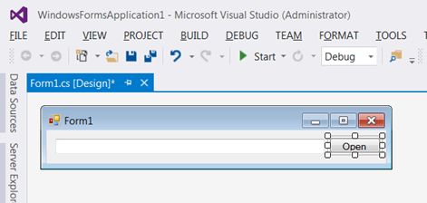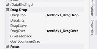 The method “.Data.GetDataPresent(DataFormats.FileDrop)” check if is a File droping. In case true, we set the effect to “Link”. Now we need to create event DragDrop on textbox: