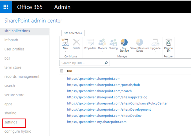 Step 3 - On SharePoint admin page, select 'Settings'. It will navigate to Settings page.