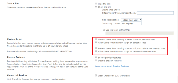 Enabling the Custom Scripts is allowing the users to run the custom scripts on personal sites and self-service created sites. Without enabling the custom scripts, we can’t embed the script in personal sites using SharePoint designer.