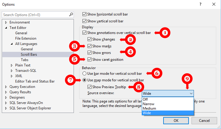 By default, all its sub elements are set to show on the scroll bar in SSMS 2016 in addition to it. Hence, without making any changes, you should be able to see these color marks. Unchecking it will disable all the Annotations on the scroll bar.