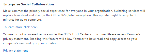Here you can choose whether you want the default collaboration center for all the sites in your tenant to be through Yammer or the default Newsfeed functionality.