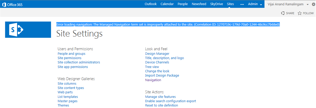 Error loading navigation: The Managed Navigation term set is improperly attached to the site