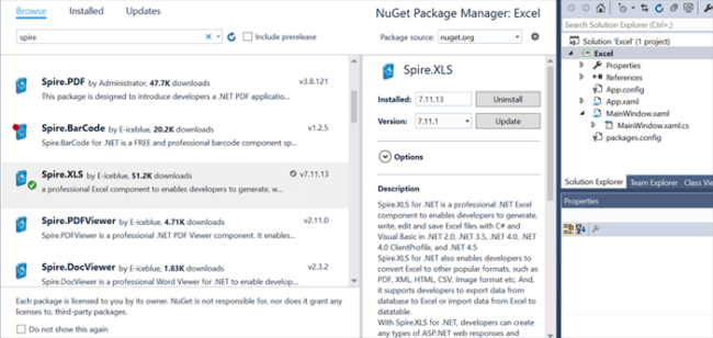 I created a simple WPF application and installed "Spire.XLS" using NuGet Package Manager.