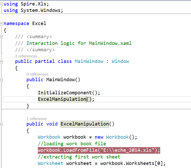 Now, I am using Spire.XlS for loading an existing Excel file. From Excel workbook, we are extracting the first worksheet.