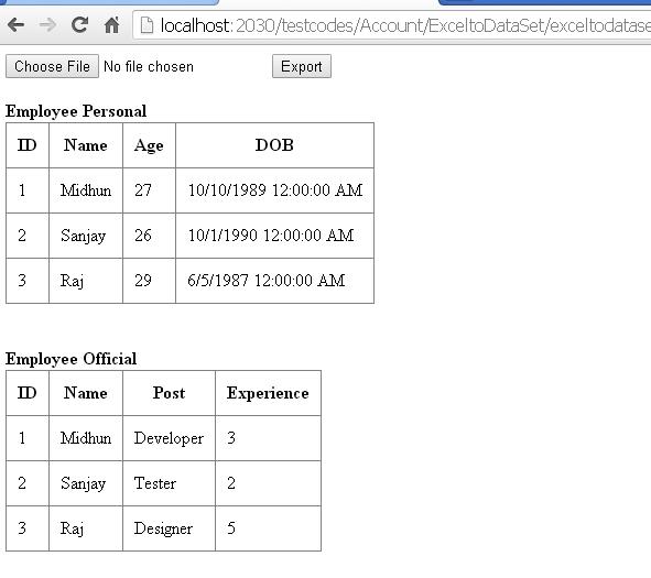 After selecting our Excel file and clicking on export button, we will get the corresponding data in GridViews, as shown below.