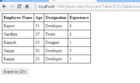 First, we will create an HTML table, which shows the employee details and an Export to CSV button, as shown below.