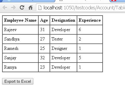 In this blog, we will see how to export an HTML table to an Excel file, using the simple table2excel jQuery plugin. First we, will create the HTML table, which shows employee details and an "Export to Excel" button, as shown below.