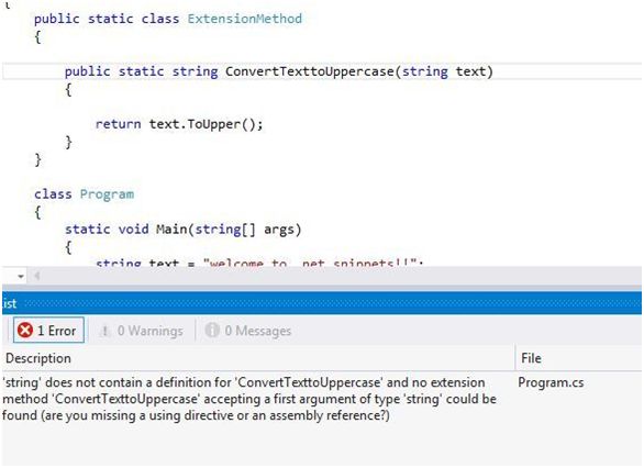 Just to make sure this keyword is important for extension method to work, let us remove the “this” keyword” and check what happens. Remove the keyword and build the program. We get the below error in the program.