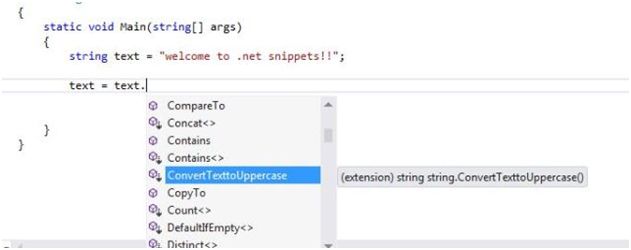 In the example we have a string with some text assigned. Our requirement is to convert the string to uppercase. So we have used this extension method on the string. When we write text and press dot we get the method in the intelligence on the string object. Refer to the following image.