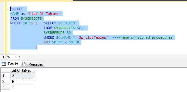 We learned about SYSOBJECTS and SYSDEPENDS in addition to learning the stored procedure, which is used in SQL query to get the table lists.