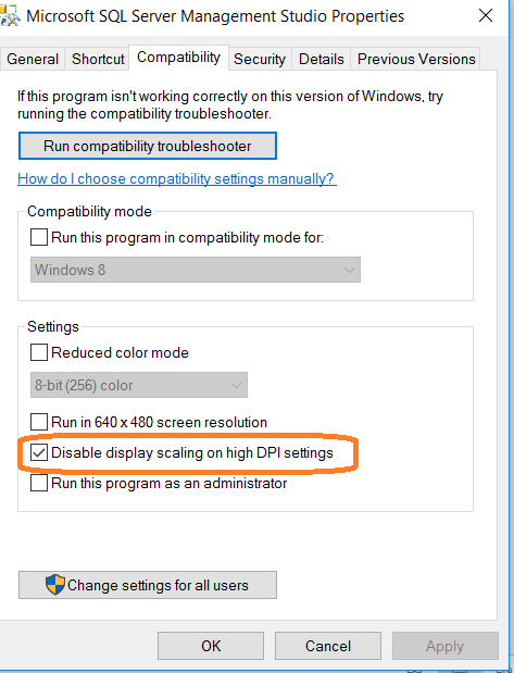 To overcome this issue, we should enable the "Disable display scaling on high DPI" settings which can be done from the SQL Server Management Studio properties section.