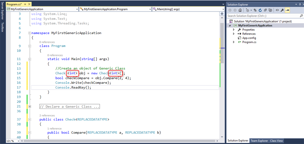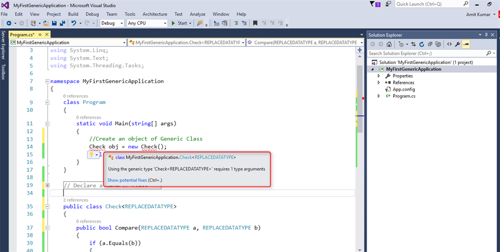 As you see above for compare two integer numbers I have to create Compare function, think about if I want to compare two string or two float values then I have to create seperate method for each. So solve this issue Generic comes.