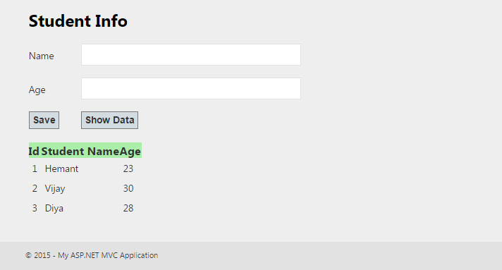 Now we have index.cshtml where we have Show Data Button for which I have ajax call for getting stud details.