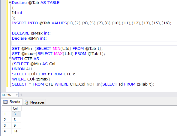 - SELECT * FROM CTE WHERE CTE.Col NOT In(SELECT Id FROM @Tab t);