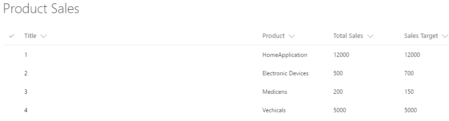 Create a custom list in SharePoint. In my case, it is "Product Sales".
