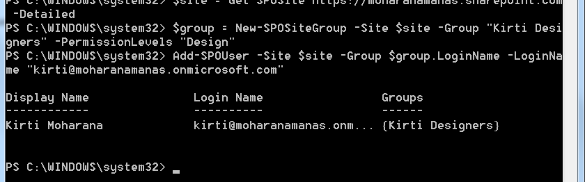 In my training after creating my site collection in SharePoint Online, I want to grant user’s access to the Site Collection. First I want to create a new SharePoint group for my personal use and then want to add users to my group. To fulfil my requirement I need to use the New-SPOSiteGroup cmdlet and the Add-SPOUser cmdlet, respectively.