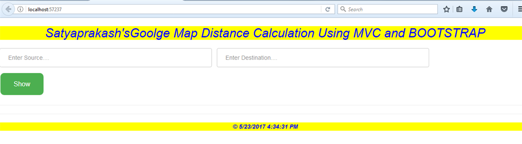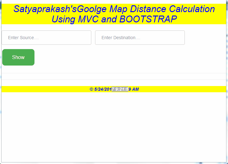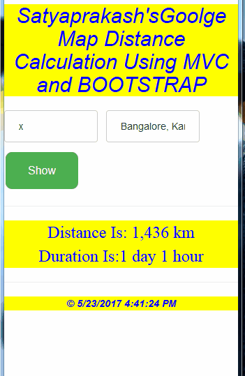 7. <h2 style="background-color: Yellow;color: Blue; text-align: center; font-style: oblique">Satyaprakash'sGoolge Map Distance Calculation Using MVC and BOOTSTRAP</h2>