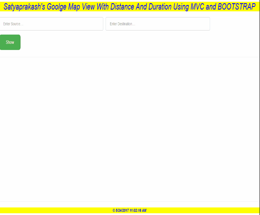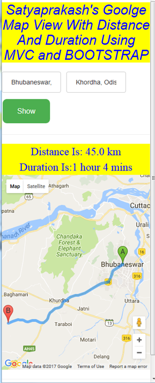 - <h2 style="background-color: Yellow;color: Blue; text-align: center; font-style: oblique">Satyaprakash'sGoolge Map Distance Calculation Using MVC and BOOTSTRAP</h2>