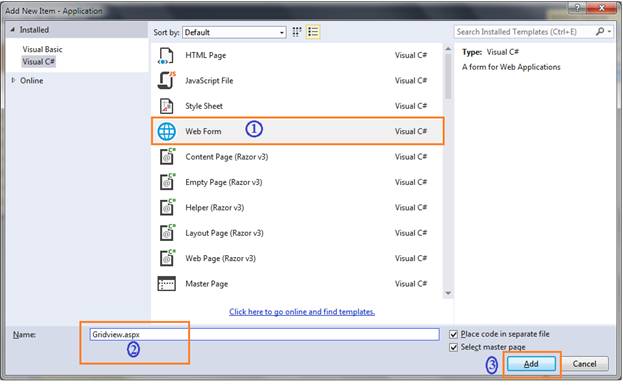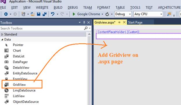 Go to Gridview.aspx page >> Toolbox >> Add GridView.