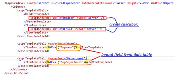 In default GridView, we bind two data fields from our database table and create checkbox control using GridView TemplateField.