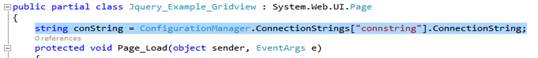 • Access the database connection string from web.config file on Gridview.aspx.cs, as shown below.