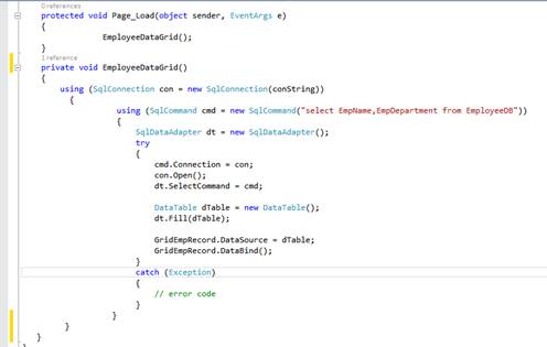 17.             using(SqlCommand cmd = new SqlCommand("select EmpName,EmpDepartment from EmployeeDB")) {