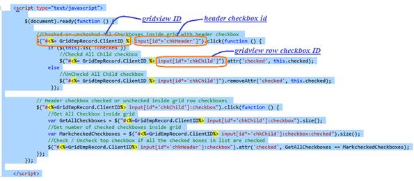 Now, we need to write a few lines of jQuery code to the checked or unchecked function for GridView header checkbox and GridView row checkbox.