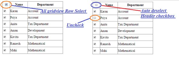 You may have seen this type of check/uncheck checkbox control in email (like Gmail, Hotmail, Yahoo etc.) GridView. If you are using a checkbox control in GridView, then necessarily add the header checkbox in a GridView header.