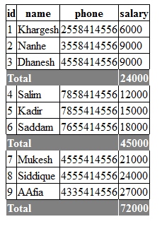 - SqlCommand cmd = new SqlCommand(" select a.id,a.DeptId,a.Name,a.Phone,a.tot,b.total,b.DeptId from ( select e1.id, e1.DeptId,e1.Name,e1.Phone,sum(es.Salary) as tot from Department D1 join Employee e1 on D1.ID=e1.Deptid join EmployeeSalary es on e1.Id = es.EmployeeId group by d1.id ,e1.Id,e1.deptid,e1.Name,e1.Phone,es.Salary ) a join ( select deptid, SUM(Salary) as total from EmployeeSalary group by deptid ) b on a.DeptId=b.deptid", con);