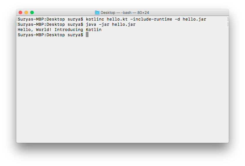 $ kotlinc hello.kt -include-runtime -d hello.jar .