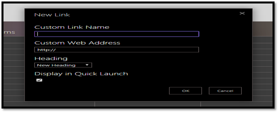 Give the custom web address in the above figure and check the display in Quick Launch option to see a new link in Quick Launch panel.