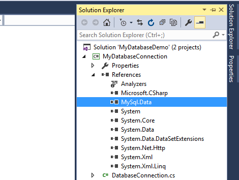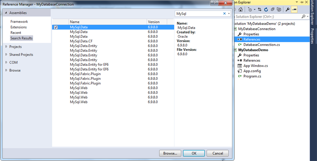 Step 3: Select the project from solution explorer. Add reference of MySql.Data in the project from “