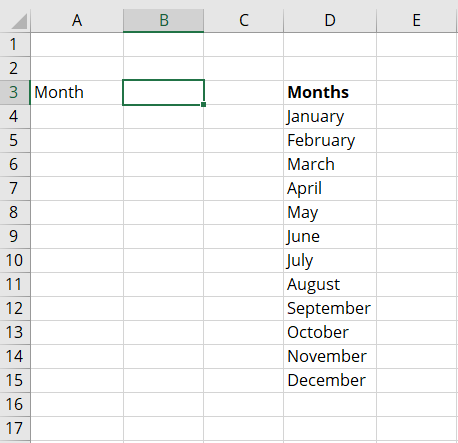 First create your list which you want to use in Drop-Down. It may be Numeric, Alphabetic, and Symbols. Let’s create a list of Months January, February, March, April, may, June, July, August, September, October, November and December.