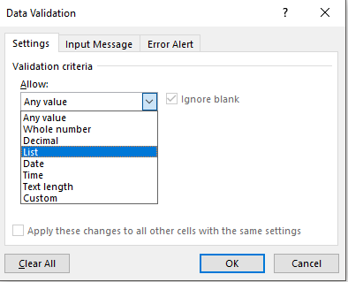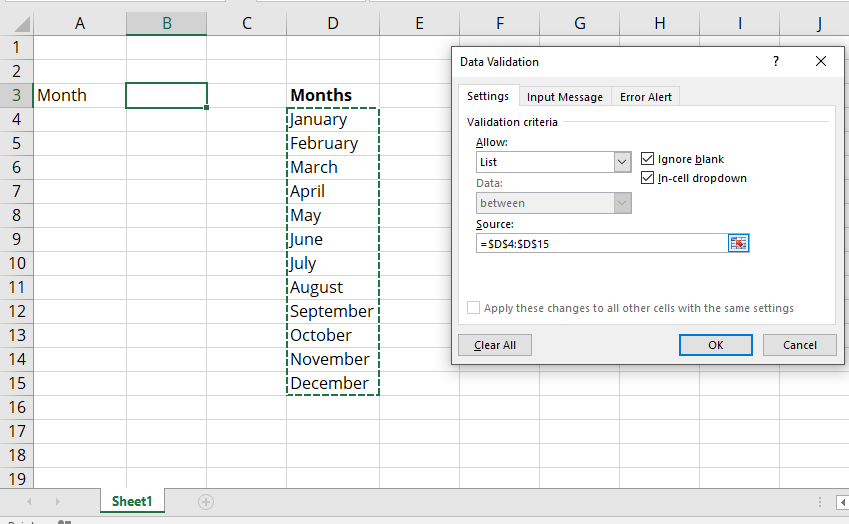 After Selecting List it will ask you for the source data which we use in Drop-down list. Select list of month’s name and ok.