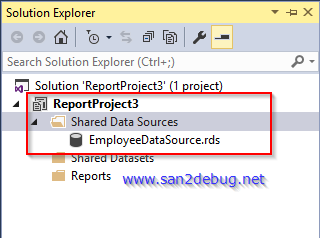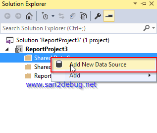 After creating an SSRS Project successfully, go to "Shared Data Source" folder, right-click on it, and point to Add -> New Item and click the New Item.