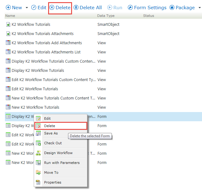 I have a custom list named “K2 Workflow Tutorials” in which I have generated the SmartForms. In this blog you will see how to delete Forms and Views in the K2 Application.