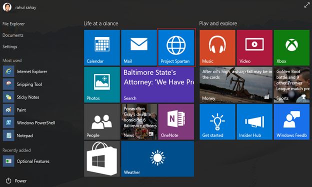 After doing above settings, you need to restart the PC to sync the settings. Once you restart, you will notice project Spartan logo on start screen which you can apply to taskbar as well as shown below.