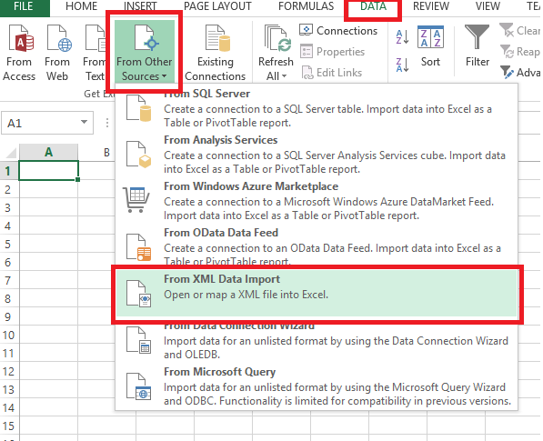 Click on Data Tab, Select From Other Sources -> From XML Data Import, Shown as per below Screen.